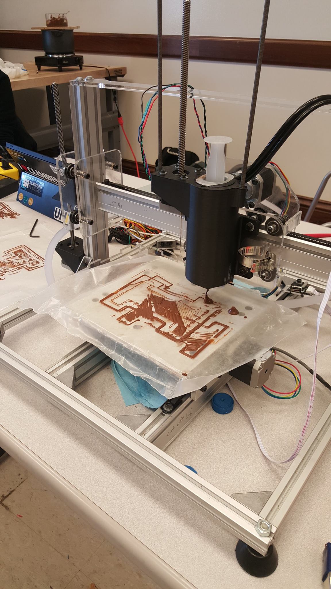 We chose to use the Arduino Mega with the ATmega1280 and the RepRap Arduino Mega Pololu Shield (RAMPS) since it had all the desired I/O and a large support community built around it. The printer included 4 stepper motors, one for each axis and one for the extruder. The gantry system was inspired by the RepRap open source 3D printing system. Marlin firmware was used and optimized for chocolate printing and use with our pulley system. The aluminum build plate had bent copper tubing installed under it to reduce temperature gradients when cycling a refrigerant. We were able to achieve a successful 1st layer but had insufficient cooling for building a structure. As I was graduating, a new cooling system was being outfitted with thermoelectric cooling modules (Peltier modules) and other chocolates were being researched for more suitable thermal properties. Additionally, a better insulated syringe design was in the works with talks of including a heating element in the on-board chocolate reservoir.
