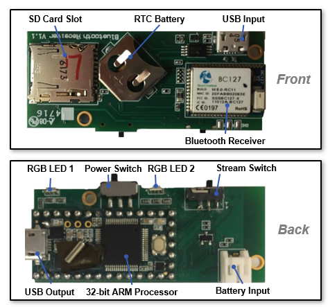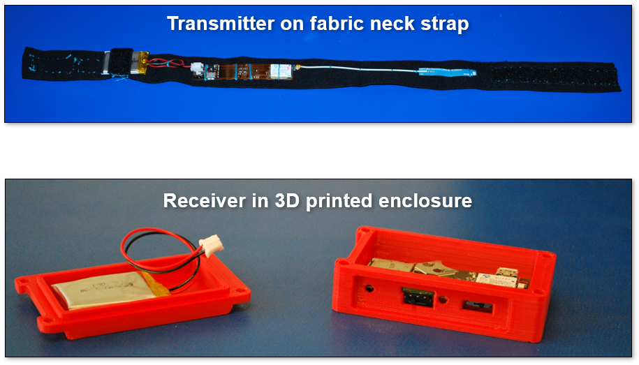 While at MIT Lincoln Laboratory, I created a lightweight, on-body, wireless system designed for monitoring real-world voice characteristics and behavior. The system has the potential to provide important assessments of voice and speech disorders, psychological and emotional state, and the impact of environmental sound levels. The system’s transmitter is positioned on the neck and synchronously streams dual-channel sensor data from an on-board MEMS microphone and a high bandwidth accelerometer, which acts as a noise-robust and confidential contact microphone. These data are recorded to a receiver that can store the data locally and stream a real-time feed to a computer.